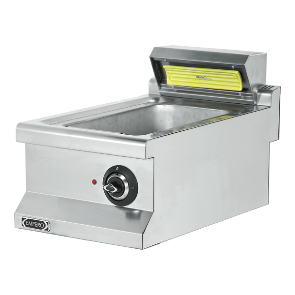 EMP.6ME010 - Termostatik kontrol. - Paslanmaz çelik sepetler. - Su doldurma musluğu. - Tahliye musluğu ile su boşaltma. - Taşan su tahliye sistemi. - Kolay temizlenebilir ve hijyeniktir. - Paslanmaz çelik gövde. EMP.6DE010 - Kızartılmış patateslerin sıcak bekletilmesinde ve yağların süzülmesinde kullanılır. - Infrared seramik ısıtıcı. - Havuzda kızartma yağının süzülmesi için maksimum verim sağlayan özel form. - Kolay temizlenebilir ve hijyeniktir. - Paslanmaz çelik gövde.